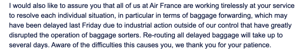 In a letter to customers, Air France's CEO apologizes and points out that it will take days to deliver to the rightful owners luggage that has "stranded" at Paris airport. The situation is no different at many European mega hubs.